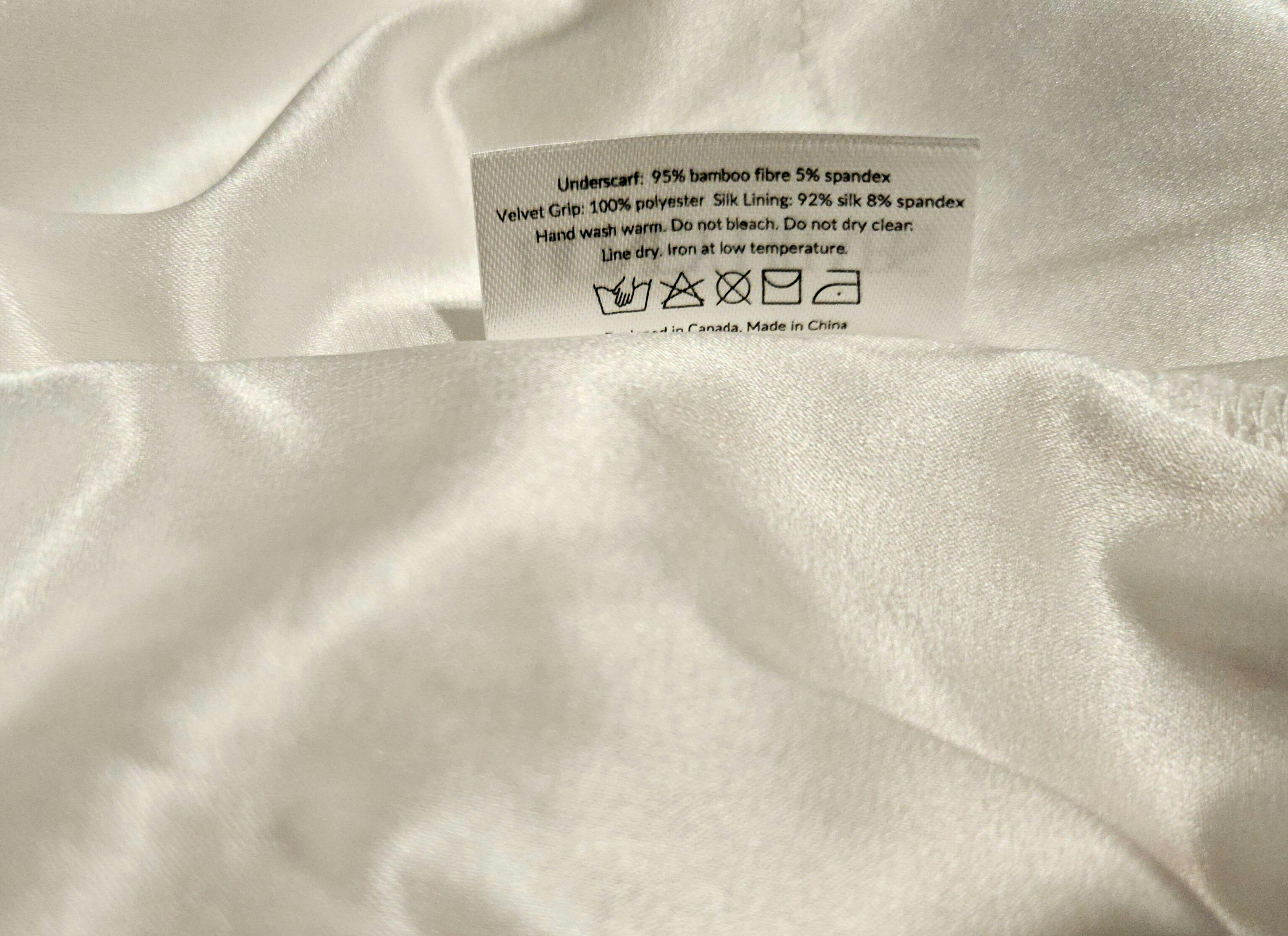 This underscarf stays on and treats your hair right. It’s lined with real silk and finished with a velvet band that helps keep everything in place.